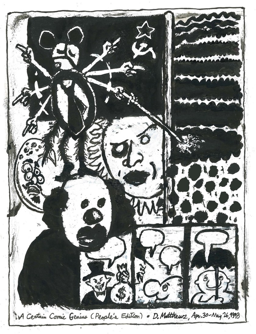 A Certain Comic Genius (People’s Edition), April 30-May 26, 1998. Ink and correction fluid on paper, 8.5″ x 11″. I significantly altered a photocopied, full-page Newsweek profile of the cartoonist Daniel Clowes.–DVM, October 17, 2019, 3:46 PM EST