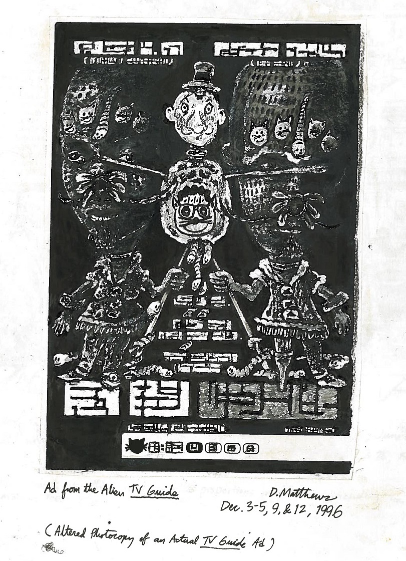 Ad from the Alien TV Guide December 3-12, 1996. Ink, lithographic crayon, correction fluid, and photocopy on paper, 8.5″ x 11″. Share this: Share on X (Opens in new window) X Share on Facebook (Opens in new window) Facebook Like Loading...
