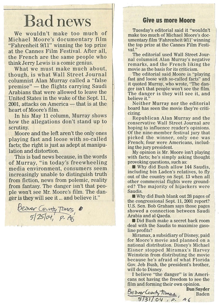 From the Beaver County Times. L-R: an editorial, May 25, 2004, p. A6; and a letter, May 31, 2004, p. A6. Note the editorial’s French-love-Jerry-Lewis “witticism” (a “witticism” Michael Moore had used on his show TV Nation, alas). Also note the letter’s pre-MeToo reference to Harvey Weinstein.–DVM, April 5, 2018, 4:55 PM EST