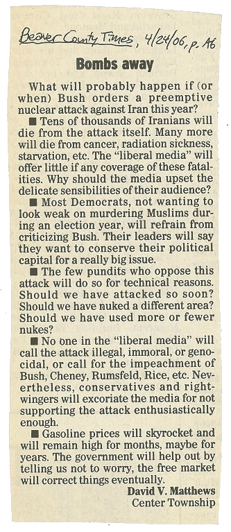 Bombs Away From the Beaver County Times, April 24, 2006, p. A6. Share this: Click to share on X (Opens in new window) X Click to share on Facebook (Opens in new window) Facebook Like Loading...
