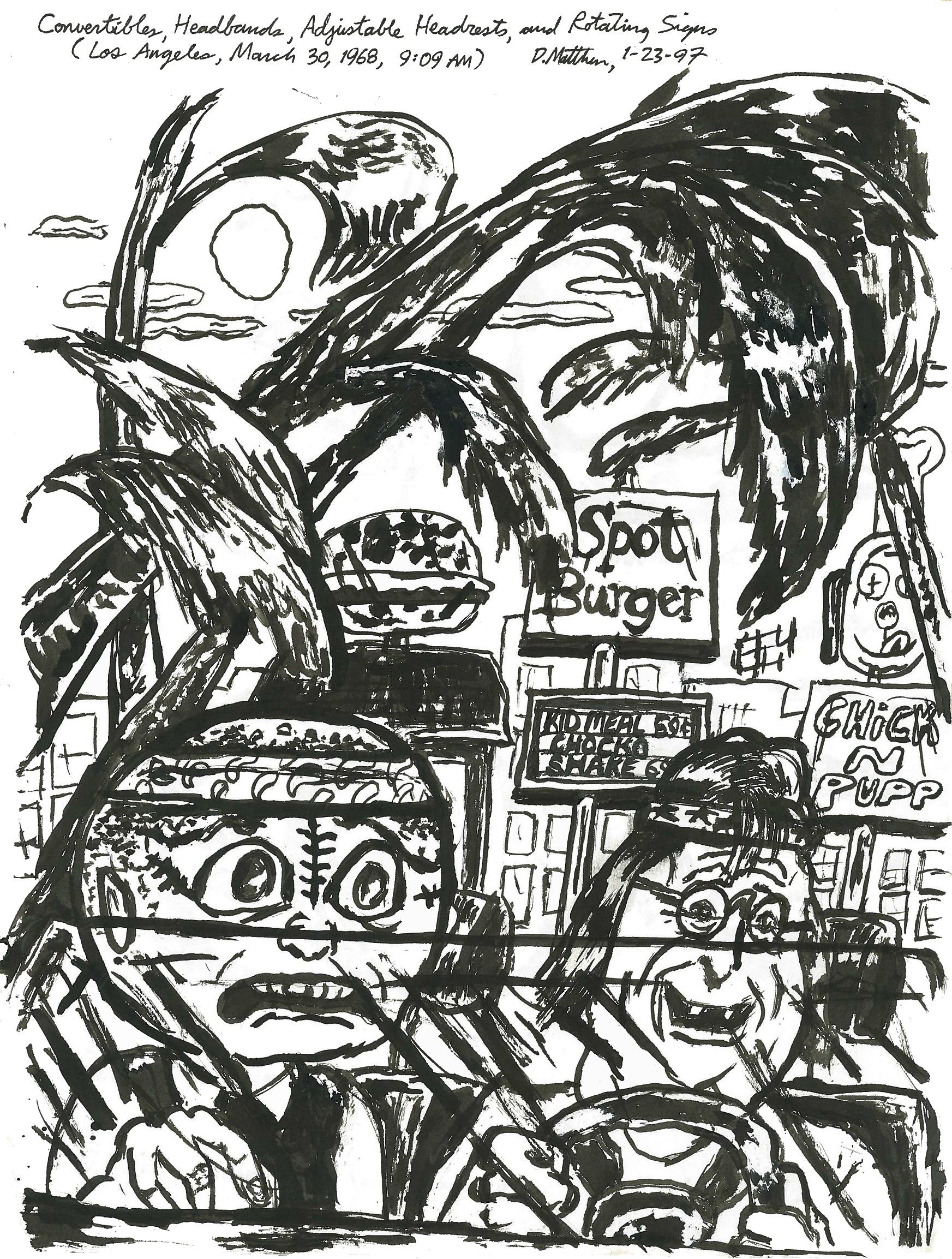 Convertibles, Headbands, Adjustable Headrests, and Rotating Signs (Los Angeles, March 30, 1968, 9:09 AM), January 23, 1997. Ink on paper, 8.5″ x 11″. This song (though not this 2003 album) inspired the drawing.