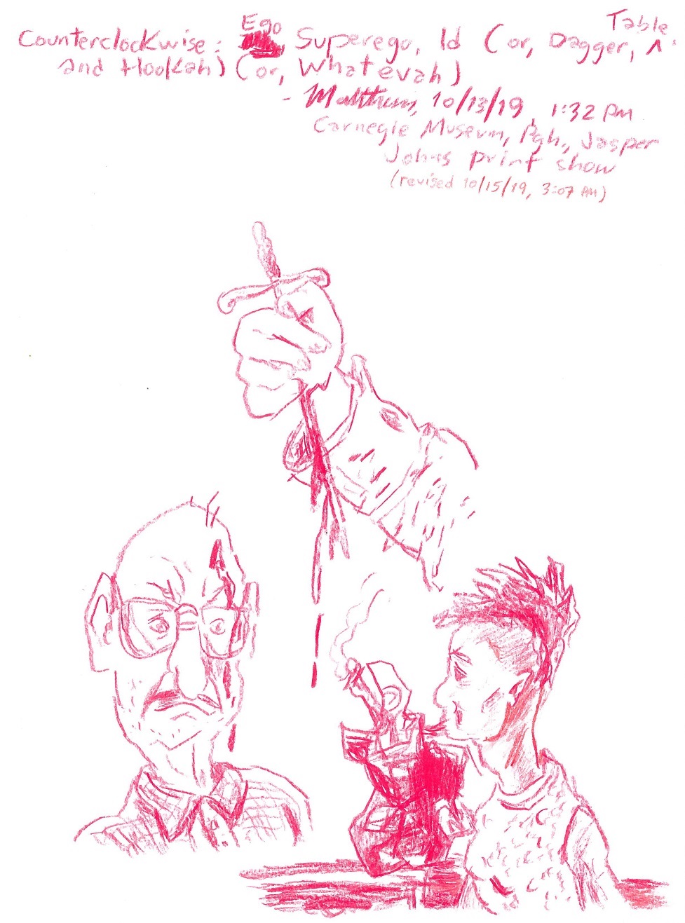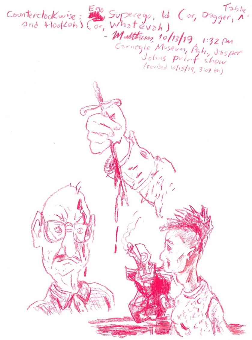 Counterclockwise: Ego, Superego, Id (or, Dagger, Table, and Hookah) (or, Whatevah), October 13, 2019 (revised October 15, 2019). Pencil on paper, 8.5″ x 11″. (In that counterclockwise list, Table refers to Cornelius Table, from the esteemed Table family outside Chattanooga.)–DVM, October 15, 2019, 5:30 PM EST