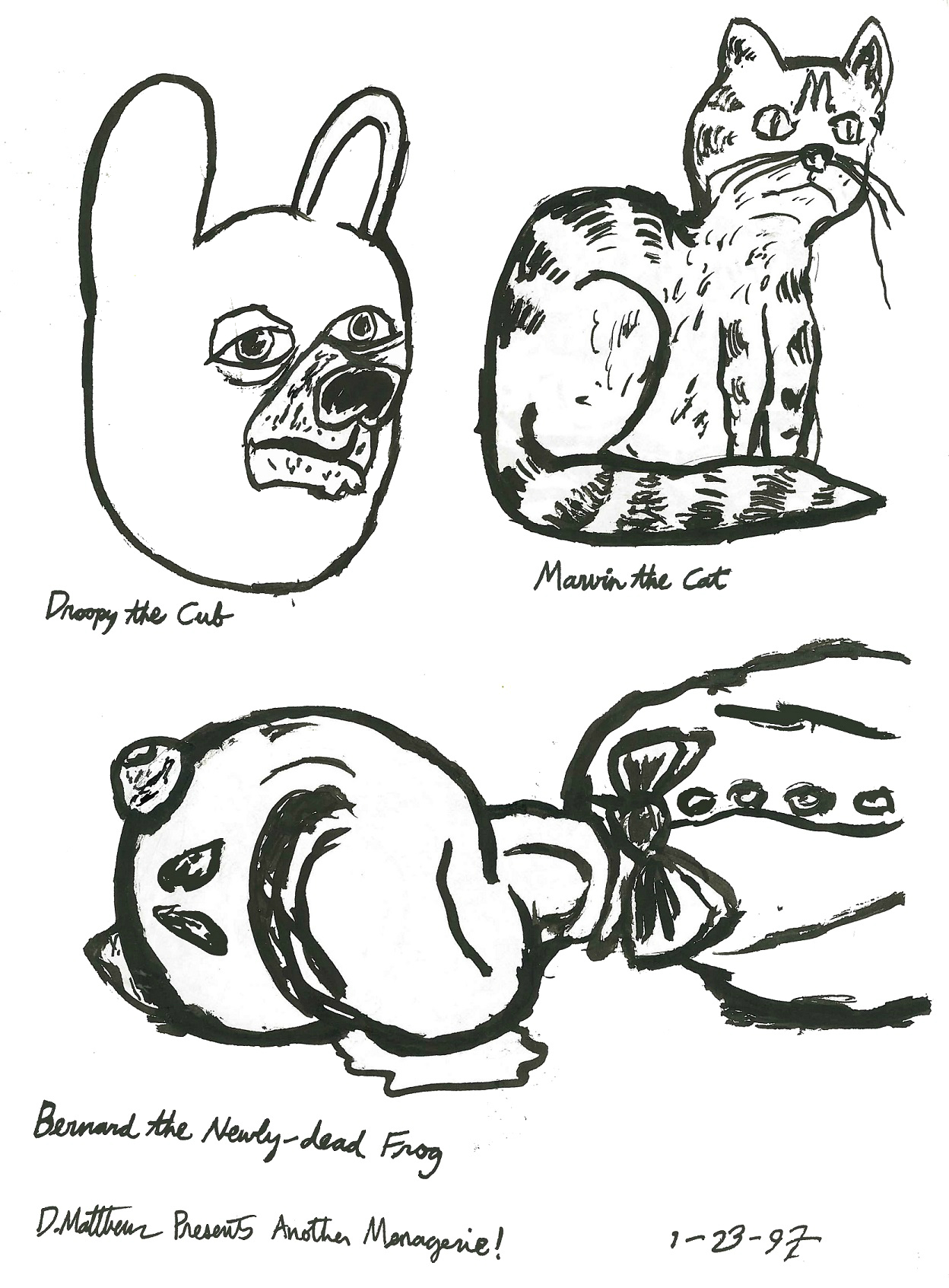 D. Matthews Presents Another Menagerie! D. Matthews Presents Another Menagerie!, January 23, 1997. Ink on paper, 8.5″ x 11″. Share this: Click to share on X (Opens in new window) X Click to share on Facebook (Opens in new window) Facebook Like Loading...