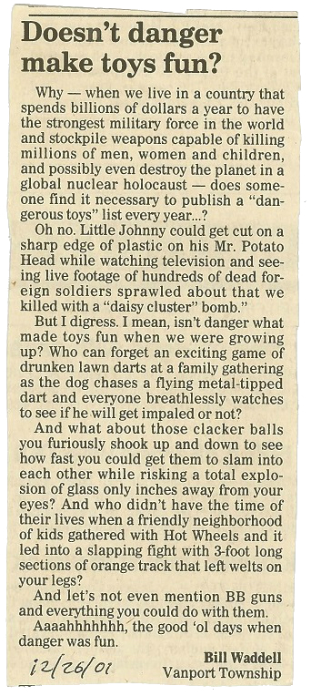 Doesn’t Danger Make Toys Fun? From the Beaver County Times, December 26, 2001. Share this: Click to share on X (Opens in new window) X Click to share on Facebook (Opens in new window) Facebook Like Loading...