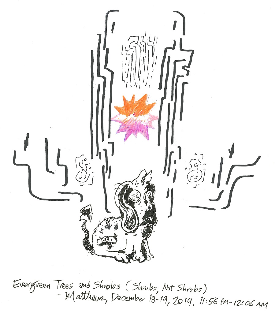 Evergreen Trees and Shrubs (Not Shrobs) Evergreen Trees and Shrubs (Not Shrobs), December 18-19, 2019. Marker and pencil on paper, 8.5″ x 11″. Share this: Click to share on X (Opens in new window) X Click to share on Facebook (Opens in new window) Facebook Like Loading...