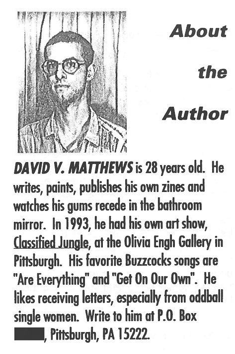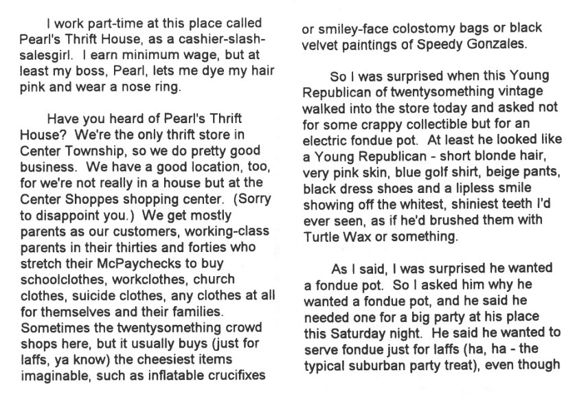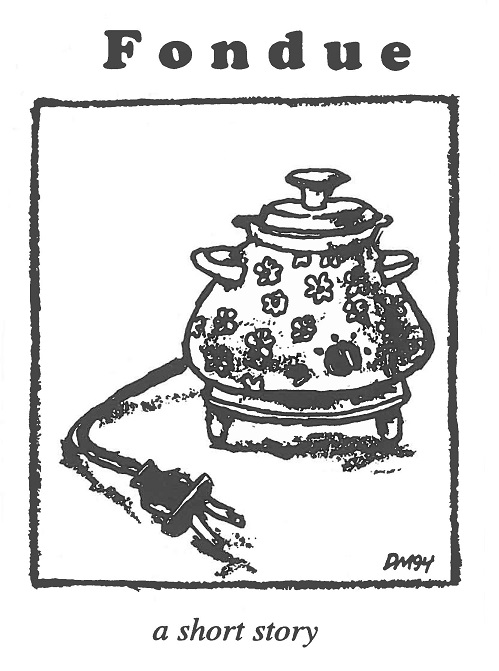 Fondue, 1994. About 2.75″ x 4.25″. An eight-page insert written and illustrated by DVM, and designed and published by Ms. Al Hoff, as part of her zine Thrift Score (motto: “A Zine about Thriftin'”). That zine, the Olivia Engh Gallery, and my Pittsburgh post-office box no longer exist. Also, the fourth paragraph mistakenly omits a line. The relevant passage should read “He said he wanted to serve fondue just for laffs (ha, ha–the typical suburban party treat), even though he had never seen it. I said I’d never seen fondue either, but then again most people probably haven’t.”–DVM, April 17, 2017, 6:39 PM EST