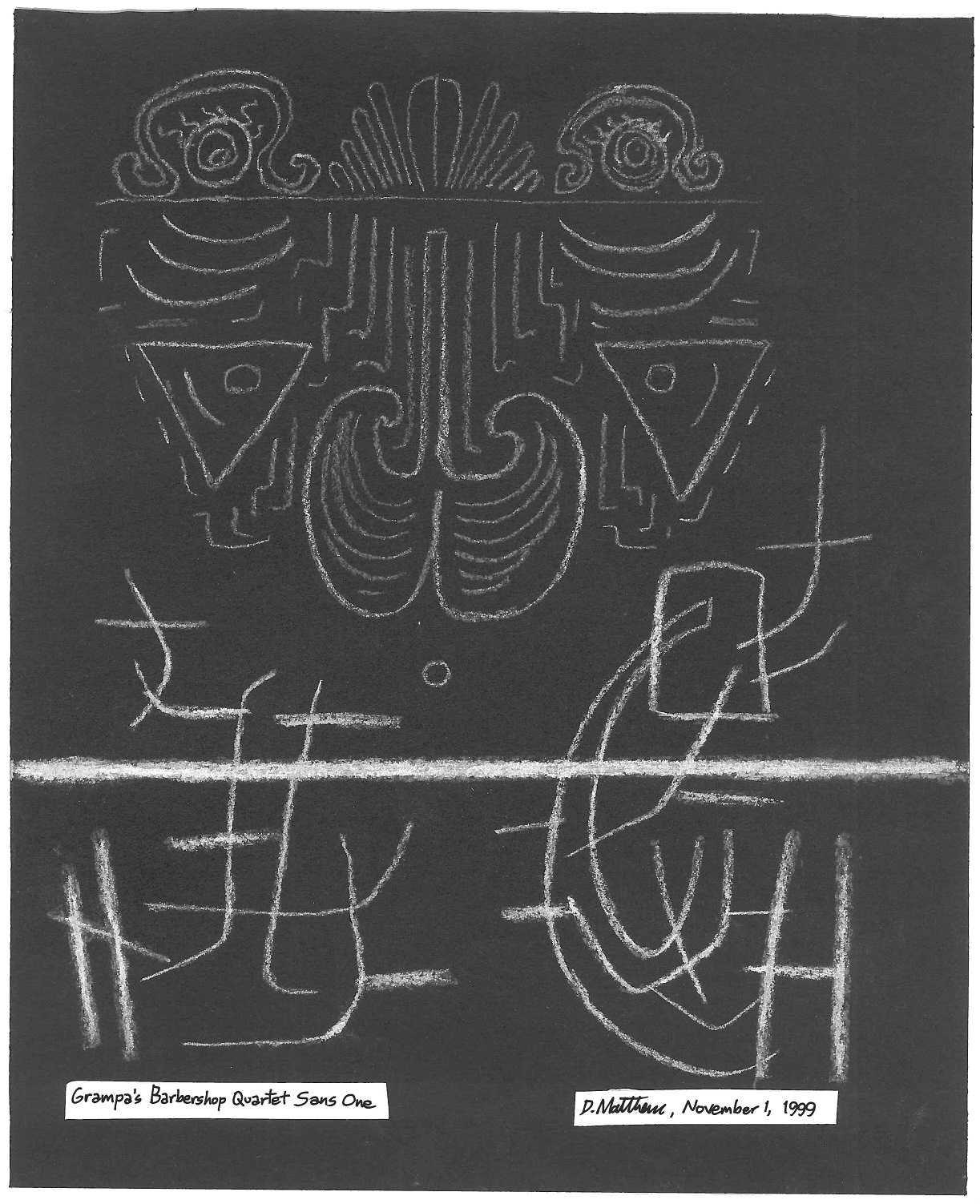 Grampa’s Barbershop Quartet Sans One Grampa’s Barbershop Quartet Sans One, November 1, 1999. Conté crayon on paper, 8″ x 9.75″. Share this: Click to share on X (Opens in new window) X Click to share on Facebook (Opens in new window) Facebook Like Loading...