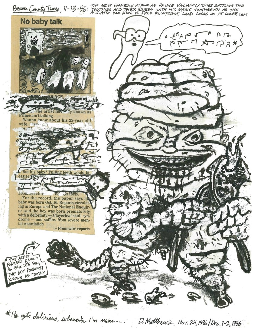 He Gets Delirious, Whenever I’m Near…, November 24, 1996/December 1-2, 1996. Ink, lithographic crayon, correction fluid, and newspaper article on paper, 8.5″ x 11″. I hadn’t noticed the Prince Valiant pun until my girlfriend pointed it out just now.–DVM, January 27, 2019, 3:18 PM EST