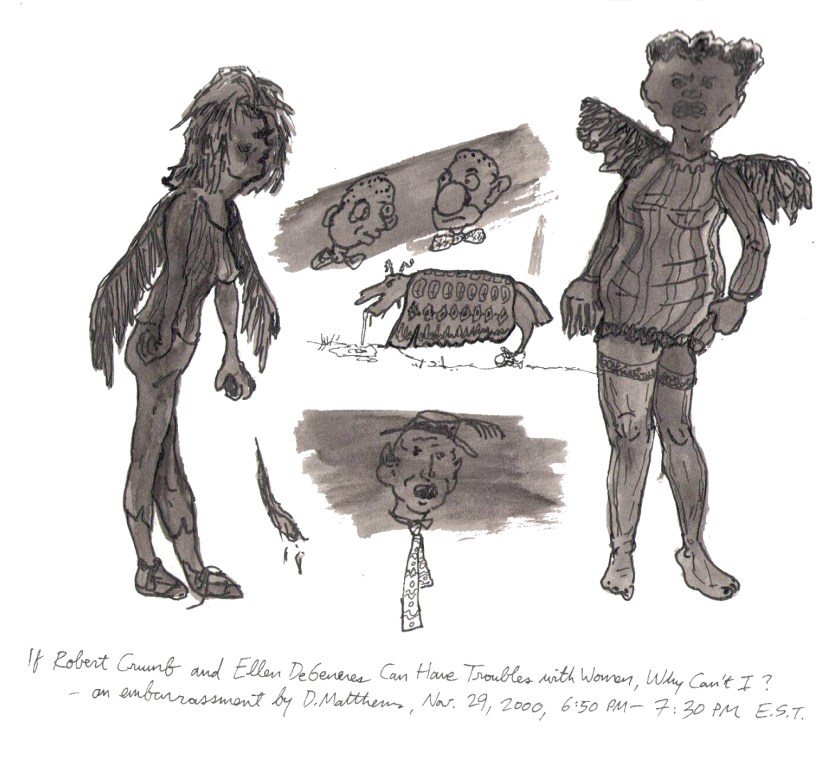 If Robert Crumb and Ellen DeGeneres… If Robert Crumb and Ellen DeGeneres Can Have Troubles with Women, Why Can’t I?, November 29, 2000. Ink on paper, 8.5″ x 11″. Share this: Click to share on X (Opens in new window) X Click to share on Facebook (Opens in new window) Facebook Like Loading...