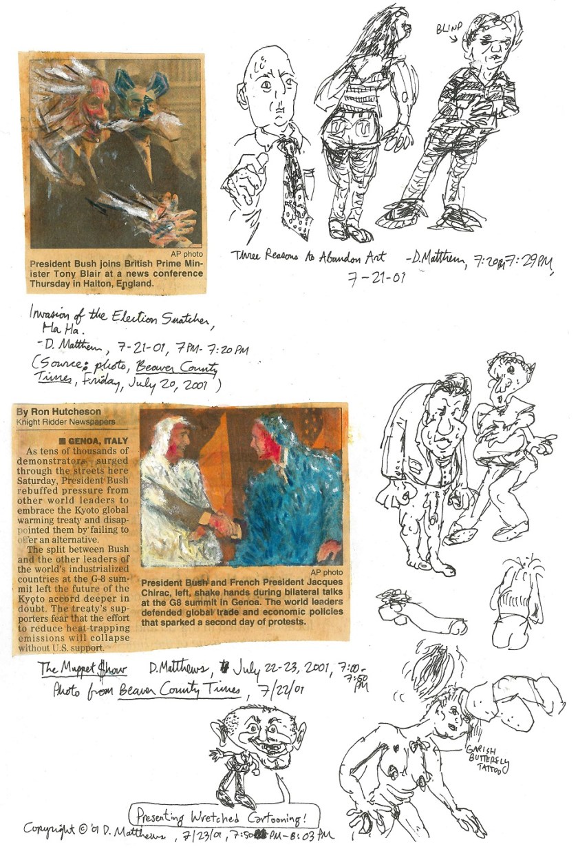 Invasion of the Election Snatcher, Ha Ha, &c. Invasion of the Election Snatcher, Ha Ha, &c., July 21-23, 2001. Ink, pencil, lithographic crayon, Conté crayon, correction fluid, and newspaper clippings on paper, 8.5″ x 11″. Share this: Click to share on X (Opens in new window) X Click to share on Facebook (Opens in new window) Facebook Like Loading...
