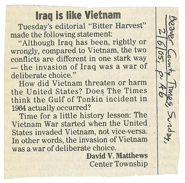 Iraq Is Like Vietnam From the Beaver County Times, February 6, 2005, p. A6. Share this: Click to share on X (Opens in new window) X Click to share on Facebook (Opens in new window) Facebook Like Loading...