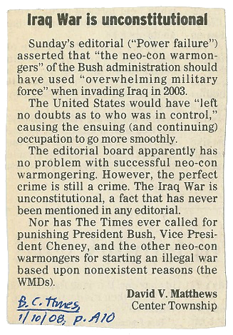 Iraq War Is Unconstitutional From the Beaver County Times, January 10, 2008, p. A10. Share this: Click to share on X (Opens in new window) X Click to share on Facebook (Opens in new window) Facebook Like Loading...