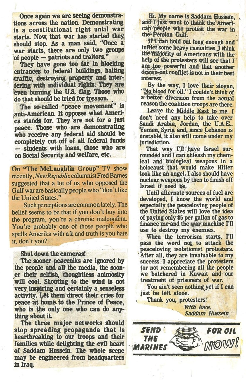 From Iraqi Stud Missile Launcher: A Scrapbook about the Persian Gulf War, 1993.  Original art 5.5″ x 8.5″.  I’d used rubber cement instead of acid-free glue, and I’d stored the collages in a warm area.  As a result, the paper has yellowed, and most of the clippings have fallen off, and I’ve had problems recreating some of the original layouts, since I no longer own a copy of the zine.  You budding artistes should learn from my mistakes.–DVM, August 24, 2017, 2:56 PM EST
