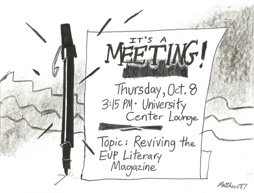 It’s a Meeting! It’s a Meeting!, 1987. Ink and lithographic crayon on paper, 11″ x 8.5″. Yes, we had the meeting, but the literary magazine never rose from the dead (despite, or maybe because of, my contributing some art).–DVM, August 9, 2019, 7:57 AM EST Share this: Click to share on X (Opens in new window) X Click to share on Facebook (Opens in new window) Facebook Like Loading...