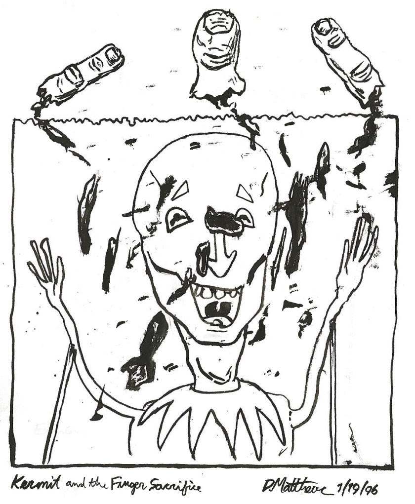 Kermit and the Finger Sacrifice January 19, 1996. Ink on paper, 8.5″ x 11″. Share this: Share on X (Opens in new window) X Share on Facebook (Opens in new window) Facebook Like Loading...