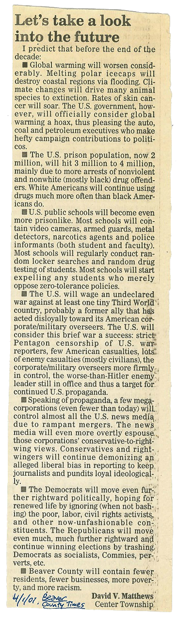 From the Beaver County Times, April 1, 2001. As for my prognosticatory accuracy: global warming did worsen considerably (e.g., Hurricane Katrina); the prison population did increase, but not to three or four million; yep, prison-like public schools; not one but TWO wars against Third-World countries (Afghanistan and Iraq); megacorporations, conservative and right-wing bias, Democrats and Republicans–all correct; a PetSmart did open in Beaver County.–DVM, September 22, 2019, 3:37 PM EST