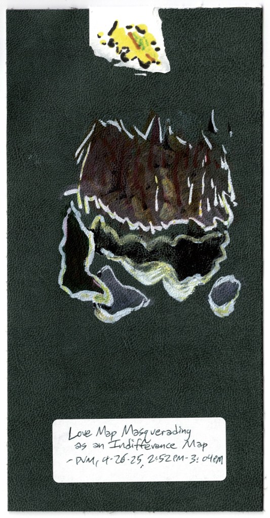 Love Map Masquerading as an Indifference Map Love Map Masquerading as an Indifference Map, April 26, 2025. Marker, paper, and leather, 4″ x 8″. Share this: Click to share on X (Opens in new window) X Click to share on Facebook (Opens in new window) Facebook Like Loading...