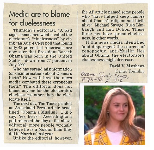 Media Are to Blame for Cluelessness From the Beaver County Times, August 25, 2010, p. A12. Share this: Click to share on X (Opens in new window) X Click to share on Facebook (Opens in new window) Facebook Like Loading...