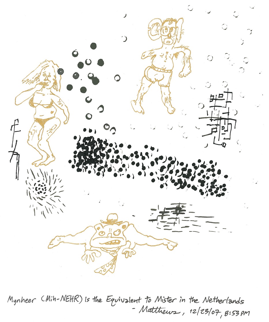 Mynheer (Mih-NEHR) Is the Equivalent… Mynheer (Mih-NEHR) Is the Equivalent to Mister in the Netherlands, December 23, 2007. Ink and acrylic on paper, 11″ x 14″. Share this: Click to share on X (Opens in new window) X Click to share on Facebook (Opens in new window) Facebook Like Loading...