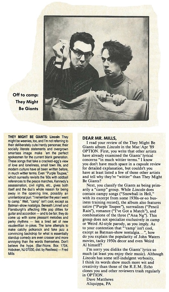From Option magazine. Clockwise from bottom left: review, March/April 1989, p. 126; photo and letter, May/June 1989, p. 7. As a result of my gushing letter, Bar/None mailed me, as a gift, a box of They Might Be Giants twelve-inch singles and promotional material, still one of the pleasantest packages I’ve ever received (though I no longer own the items, alas).–DVM, October 16, 2019, 3:59 PM EST