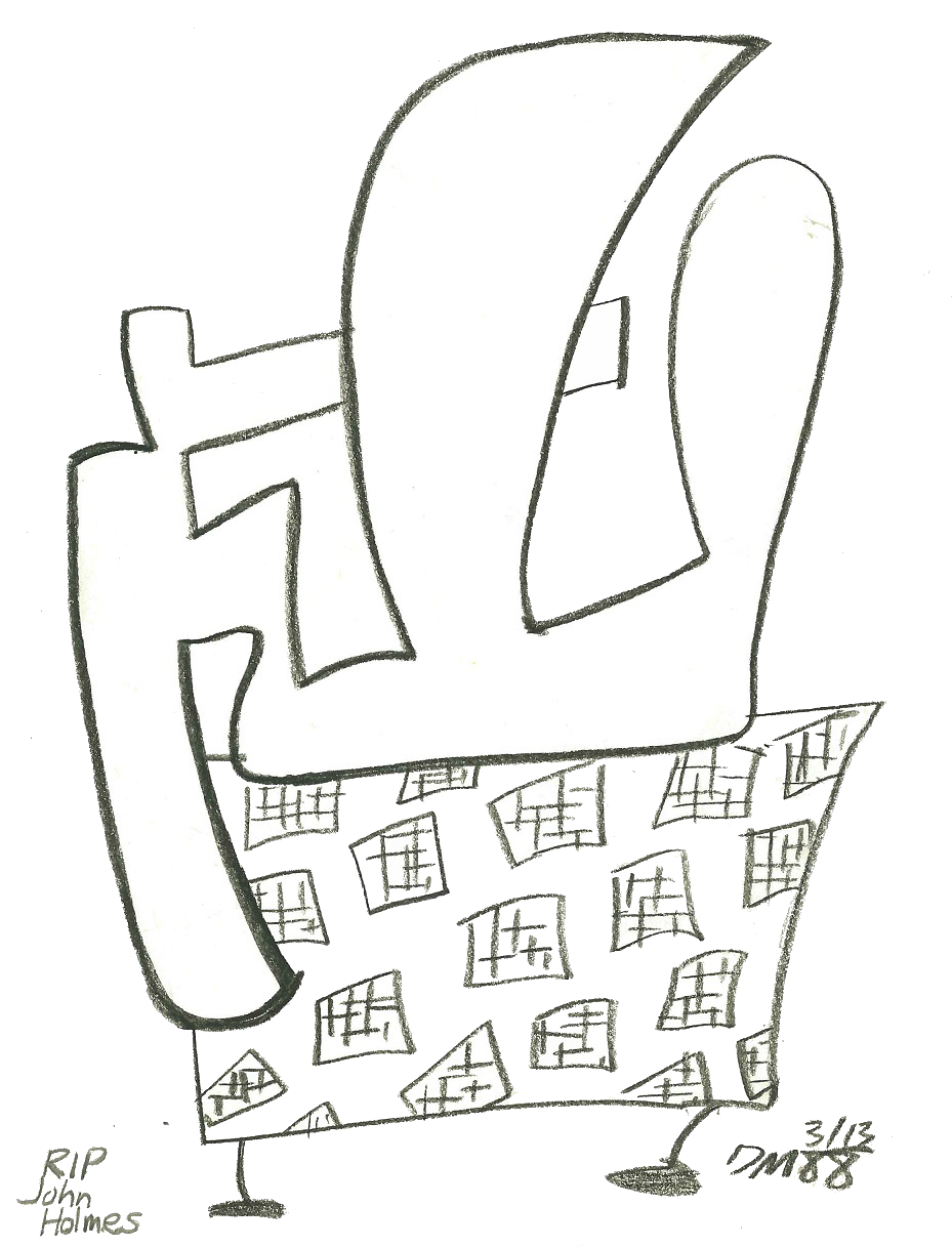 R.I.P. John Holmes R.I.P. John Holmes, March 13, 1988. Charcoal on paper, 8.5″ x 11″. Share this: Click to share on X (Opens in new window) X Click to share on Facebook (Opens in new window) Facebook Like Loading...