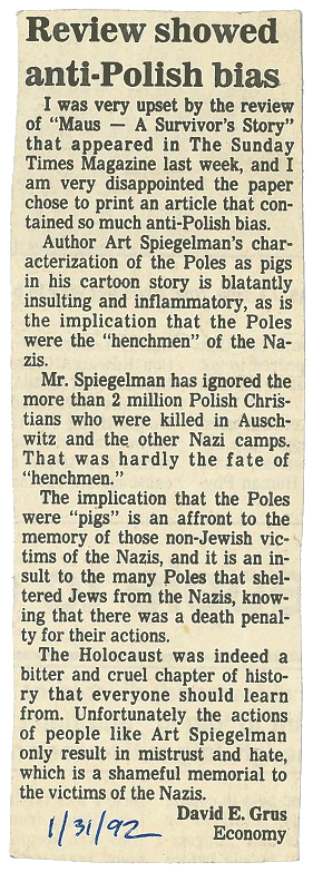 From the Beaver County Times, January 31, 1992. As an alt-comics nerd, I considered this letter especially noteworthy because American Splendor creator Harvey Pekar hated Maus in part due to the Poles-as-pigs metaphor; from 1989 to 1990, he brightened my existence by feuding epically in print, in The Comics Journal, with critic (and Maus fan) R. Fiore, who had no problems with the porcine content. Regarding Pekar’s opinions, Fiore wrote one of the greatest (as in nastiest) sentences my twentysomething self had ever read: “Now that you’ve all had time to digest Harvey Pekar’s article in Journal #130—and what a great, big, fiber-laden chunk it was—it’s as good a time as any to examine the stool.” Yes, Fiore compared the article to a piece of shit. Classy.—DVM, April 5, 2018, 4:40 PM EST