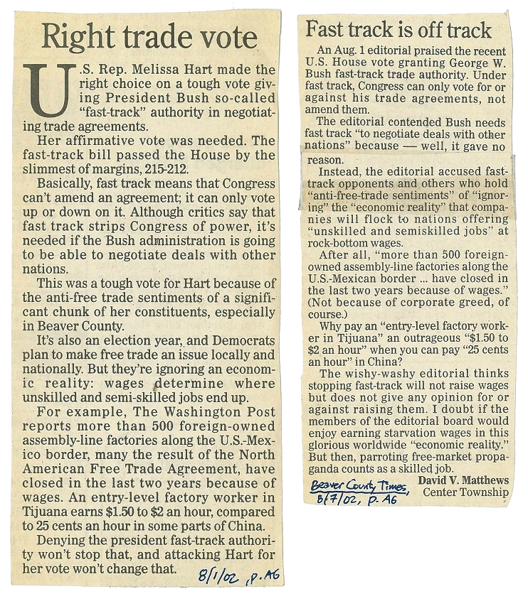 Right Trade Vote From the Beaver County Times. Left: August 1, 2002, p. A6. Right: August 7, 2002, p. A6. Share this: Click to share on X (Opens in new window) X Click to share on Facebook (Opens in new window) Facebook Like Loading...