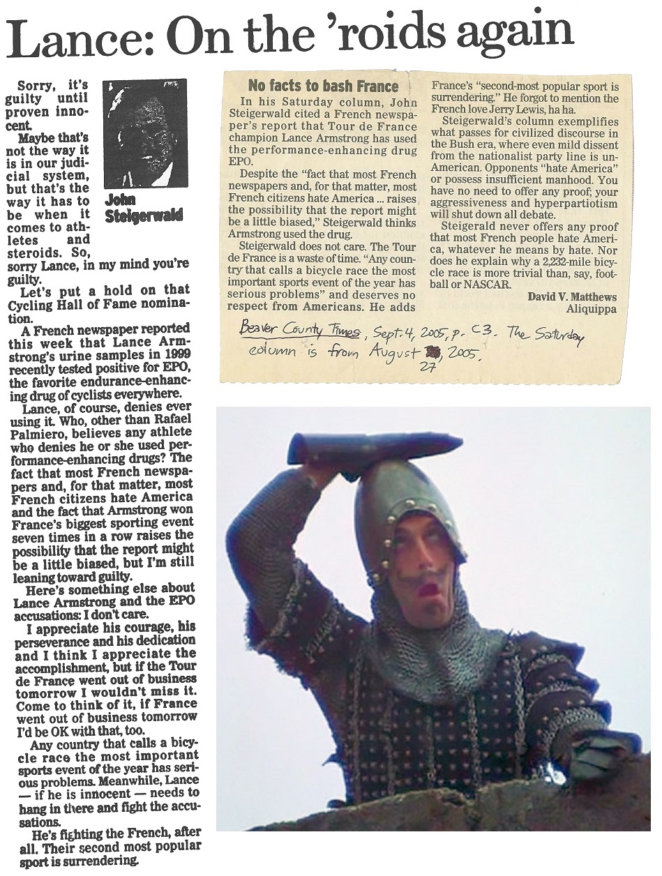 Sacré Blew!: Édition DVM John Steigerwald column: Beaver County Times, August 27, 2005, p. C2. DVM letter: Beaver County Times, September 4, 2005, p. C3. French taunter: from Monty Python and the Holy Grail (1975). Share this: Click to share on X (Opens in new window) X Click to share on Facebook (Opens in new window) Facebook Like Loading...
