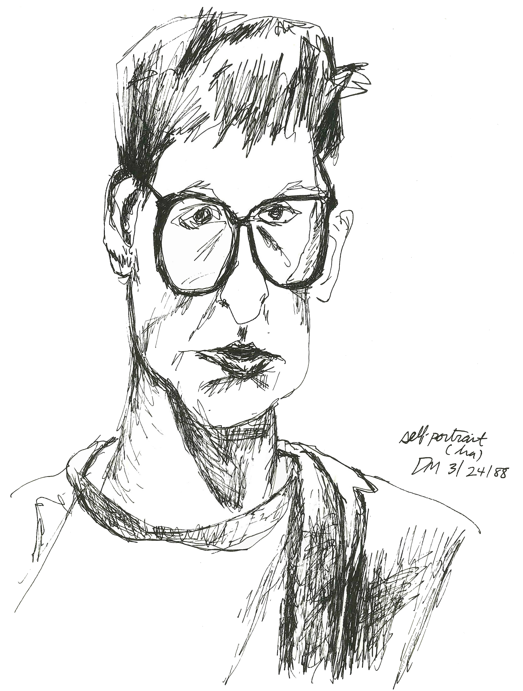 Self-portrait (Ha) Self-portrait (Ha), March 24, 1988. Ink on paper, 8.5″ x 11″. Share this: Click to share on X (Opens in new window) X Click to share on Facebook (Opens in new window) Facebook Like Loading...