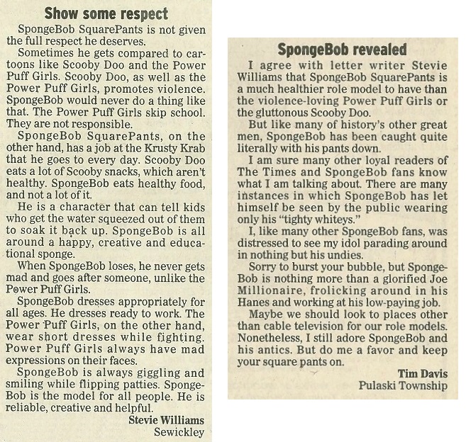 Show Some Respect and SpongeBob Revealed From the Beaver County Times. L-R: April 1, 2003, p. A6; and April 6, 2003, p. A7. Share this: Click to share on X (Opens in new window) X Click to share on Facebook (Opens in new window) Facebook Like Loading...
