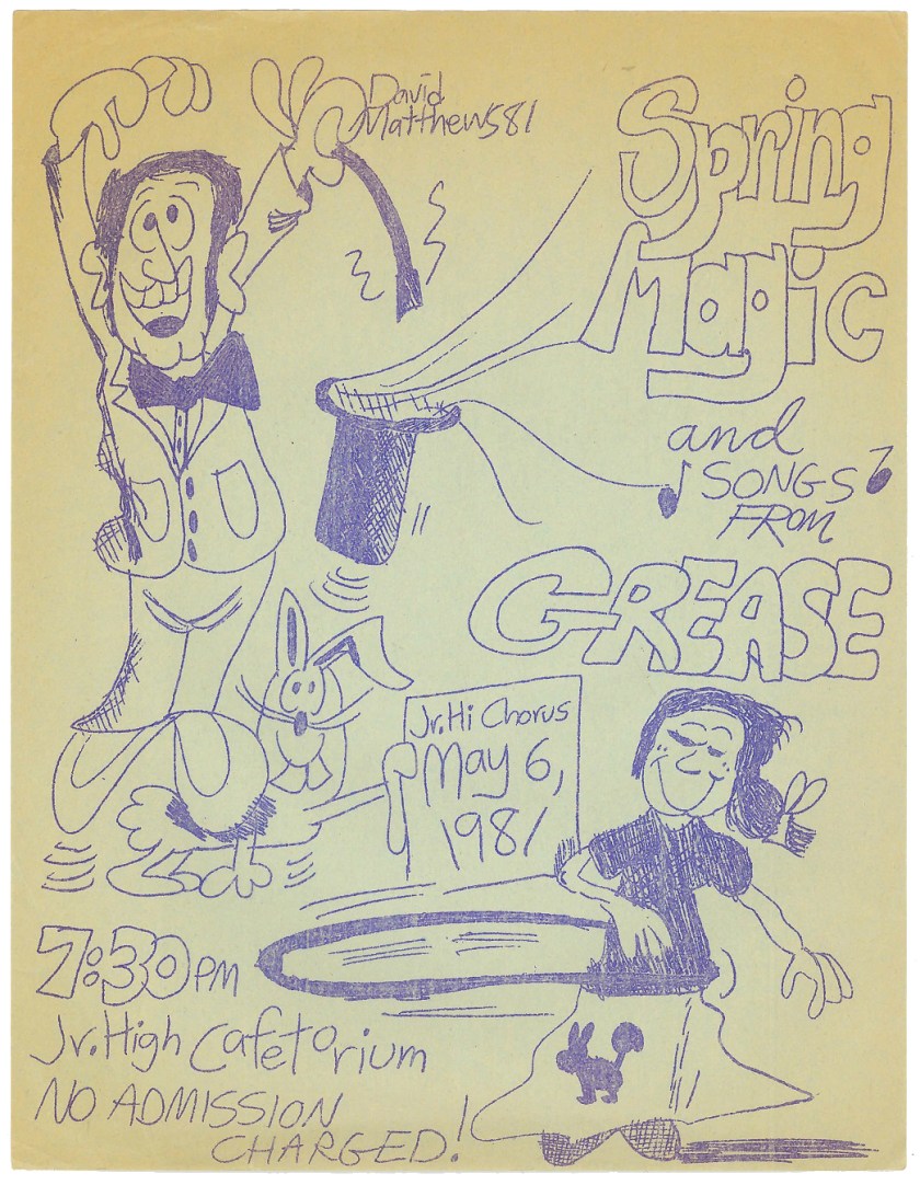 Spring Magic and Songs from Grease Spring Magic and Songs from Grease, 1981. Originally black ink on white paper, 8.5″ x 11″. Share this: Click to share on X (Opens in new window) X Click to share on Facebook (Opens in new window) Facebook Like Loading...