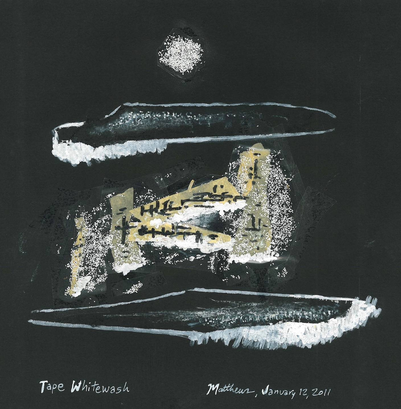 Tape Whitewash Tape Whitewash, January 12, 2011. Ink, Conté crayon, masking tape, clear tape, and sparkle on paper, 11″ x 14″. Share this: Click to share on X (Opens in new window) X Click to share on Facebook (Opens in new window) Facebook Like Loading...