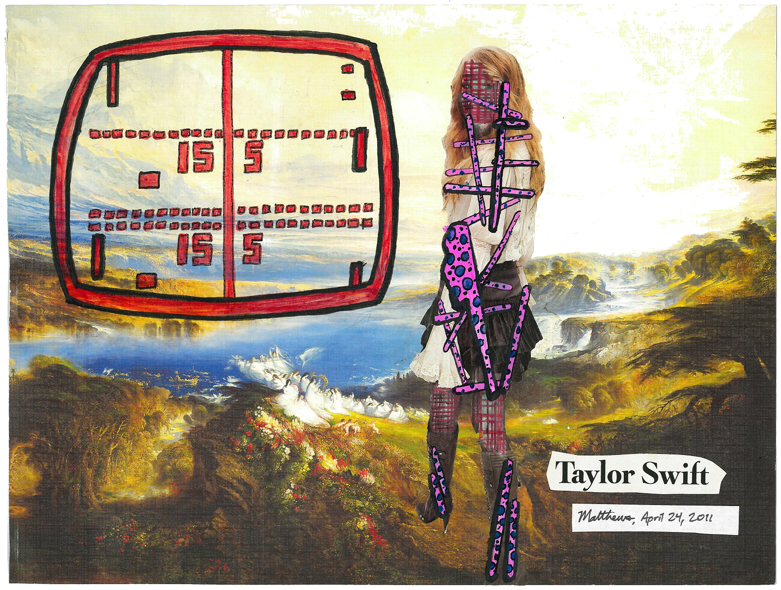 Taylor Swift, April 24, 2011. Ink, acrylic, marker, and collage on paper, 13″ x 9¾”. Background painting: John Martin, The Plains of Heaven, 1851-3.