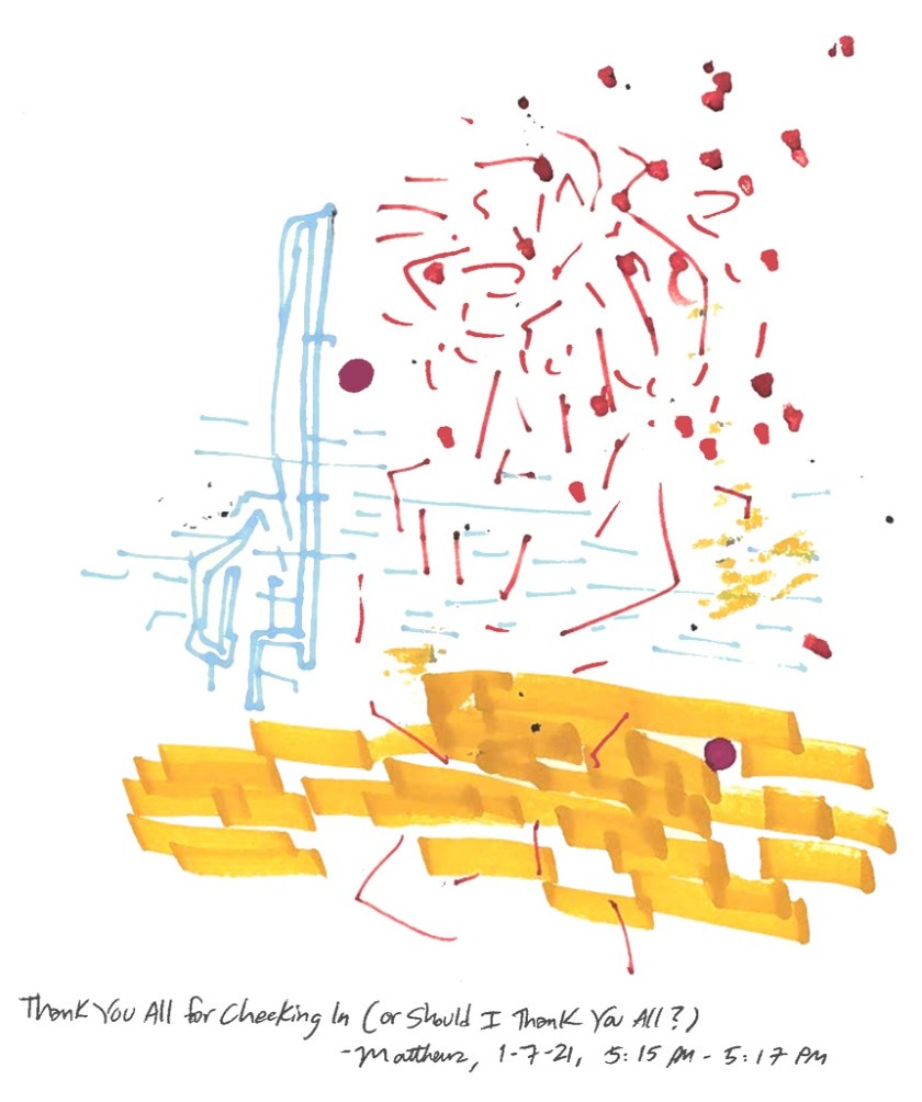 Thank You All for Checking In Thank You All for Checking In (or Should I Thank You All?), January 7, 2021. Marker on paper, 8.5″ x 11″. Share this: Click to share on X (Opens in new window) X Click to share on Facebook (Opens in new window) Facebook Like Loading...