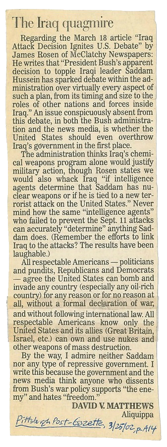 The Iraq Quagmire From the Pittsburgh Post-Gazette, March 25, 2002, p. A14. Share this: Click to share on X (Opens in new window) X Click to share on Facebook (Opens in new window) Facebook Like Loading...