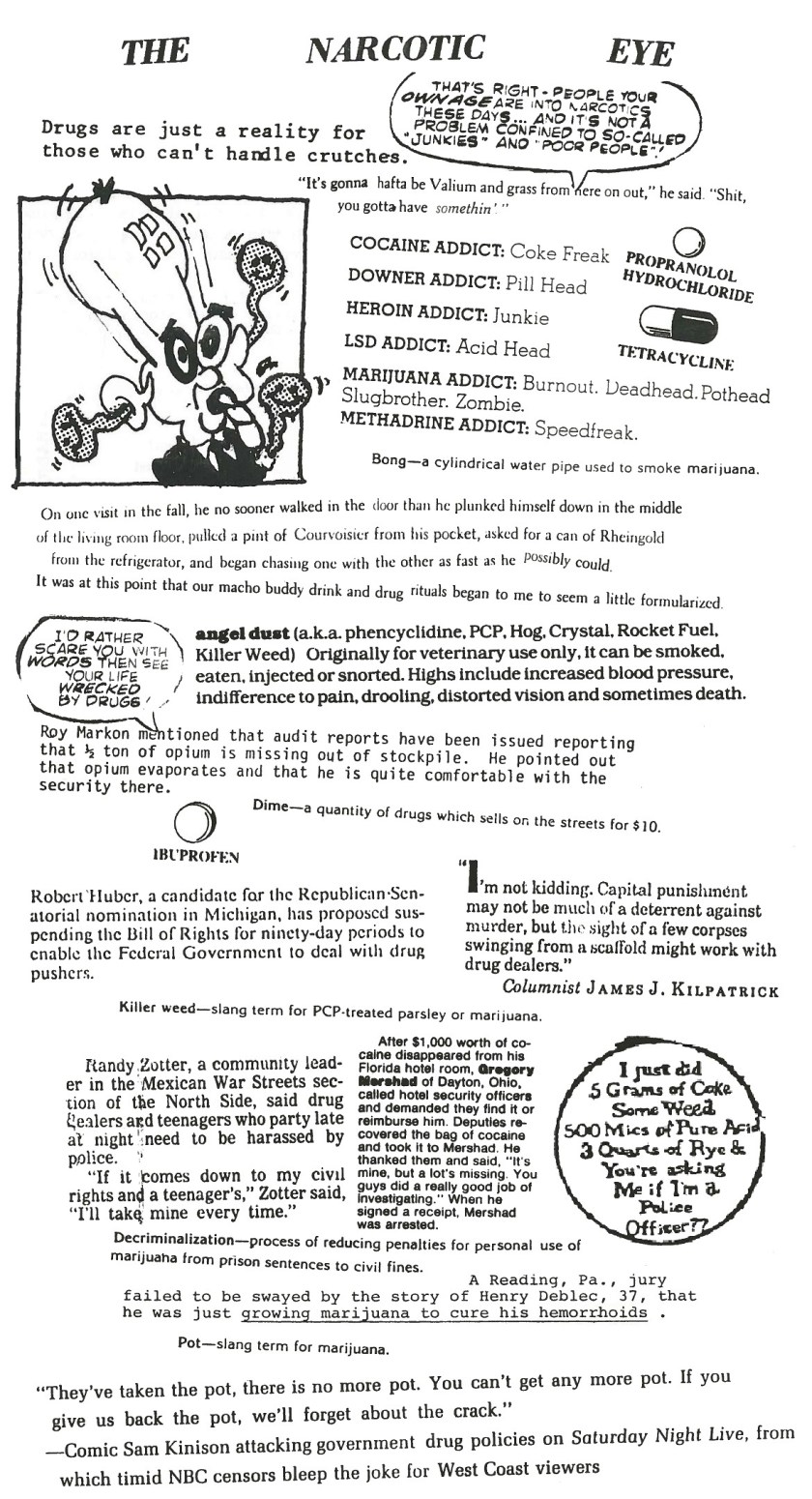 The Narcotic Eye (page 1) The Narcotic Eye (page 1), 1990 (revised and reformatted June 21, 2017). All four of these pages had originally comprised one 11″ x 17″ page. Doobie-smoking guy drawn by DVM. 1 2 3 4 Share this: Click to share on X (Opens in new window) X Click to share on Facebook (Opens in new window) Facebook Like Loading...