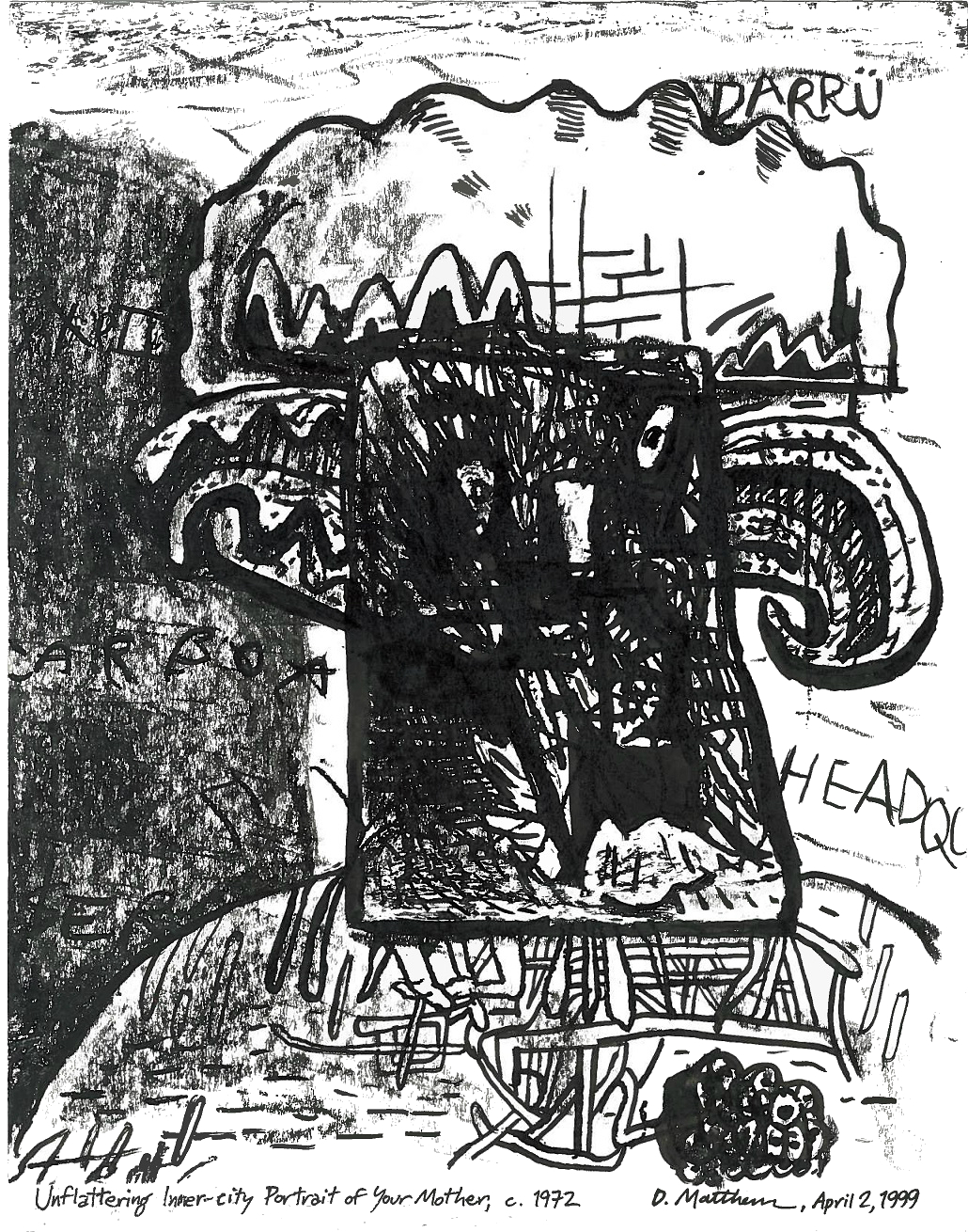 Unflattering Mother Unflattering Inner-city Portrait of Your Mother, c. 1972, April 2, 1999. Ink, lithographic crayon, and correction fluid on paper, 8.5″ x 11″. Share this: Share on X (Opens in new window) X Share on Facebook (Opens in new window) Facebook Like Loading...