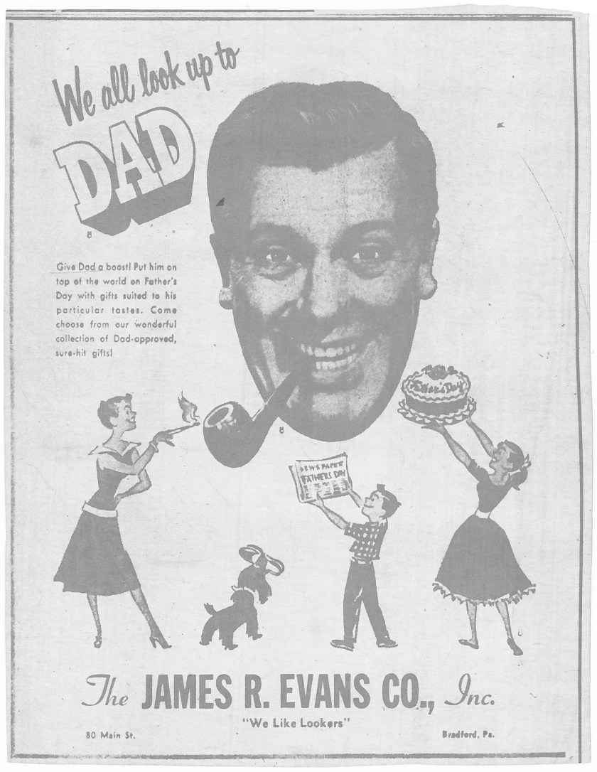 “We All Look up to Dad,” The Bradford Era, June 15, 1955. I copied this from microfilm at my college library during the mid-1980s. At the time, I had an interest in the Church of the SubGenius and its messiah, J.R. “Bob” Dobbs.