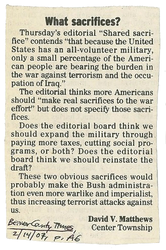 What Sacrifices? From the Beaver County Times, February 14, 2007, p. A6. Share this: Click to share on X (Opens in new window) X Click to share on Facebook (Opens in new window) Facebook Like Loading...